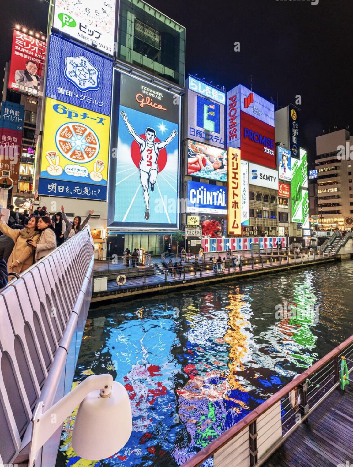 Where is the best place to photograph the Dotonbori Glico sign? The Glico sign in Japan is one of famous sightseeing spots that people take photos in front of. In front of the sign, you can see many people taking photos in the middle of Ebisubashi holding